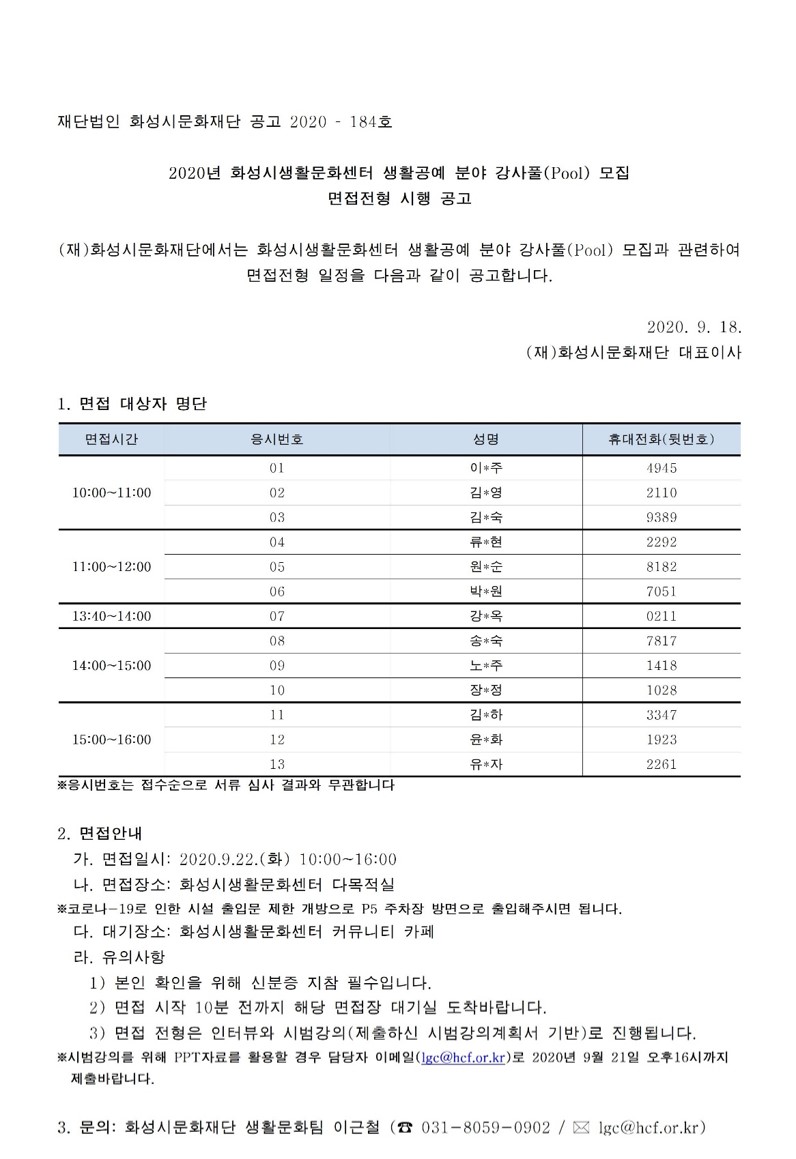 2020년 화성시생활문화센터 생활공예 분야 강사풀(Pool) 모집 면접전형 시행 공고 작성자 관리자 작성일 2020년 9월 18일 17시 42분 17초 조회 343 2020년 화성시생활문화센터 생활공예 분야 강사풀(Pool) 모집 면접전형 시행 공고 이미지.jpg [ Size : 141.29KB, Down : 227 ] 미리보기 다운로드 2020년 화성시생활문화센터 생활공예 분야 강사풀(Pool) 모집 면접전형 시행 공고.hwp [ Size : 14.5KB, Down : 237 ] 다운로드 목록보기