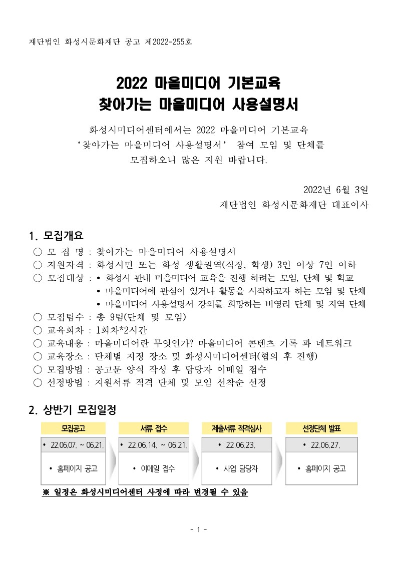 ○ 모집대상 : 화성시 관내 마을미디어 교육을 진행 하려는 모임, 단체 및 학교 마을미디어에 관심이 있거나 활동을 시작하고자 하는 모임 및 단체 마을미디어 사용설명서 강의를 희망하는 비영리 단체 및 지역 단체