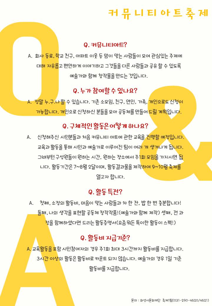 (재)화성시문화재단 축제1팀에서는 화성시민과 함께 2021년 커뮤니티아트축제를 진행 하고자 참여시민을 아래와 같이 모집합니다.