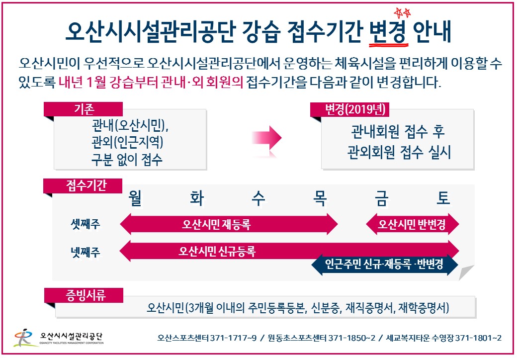 게시판 취지와 관계없는 불법정보 게시, 타인 비방, 광고성 글 등은 예고없이 삭제될 수 있습니다. 동탄복합문화센터 수영강습 늘려주세요 작성자 길호정 작성일 2018년 12월 4일 12시 12분 50초 조회 398 오산스포츠센터.jpg [ Size : 170.41KB, Down : 215 ] 미리보기 다운로드 동탄에 자리가 없어서 오산으로 다니고 있는데 오산스포츠센터 1월부터 오산시민 우선으로 등록후 남는자리를 타지역민에게 배정한다고 합니다. 그렇게 되면 동탄시민은 동탄에서만 강습을 받아야하는데 지금 강습은 너무 부족합니다. 실력등급별로 한반정도 더 운영하셨으면 좋겠습니다. 목록보기