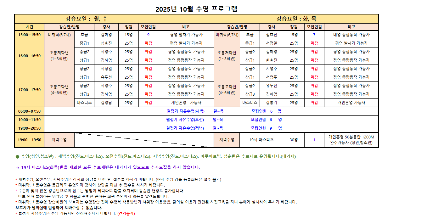 ※수영(성인,청소년) : 새벽수영(진도.마스터즈), 오전수영(진도.마스터즈), 저녁수영(진도.마스터즈), 아쿠아로빅, 청춘반은