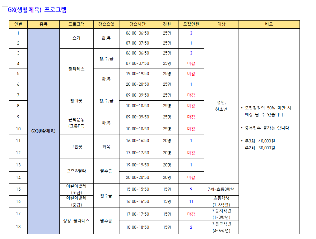 2.모집정원의 50% 미만시 폐강 될 수 있습니다.