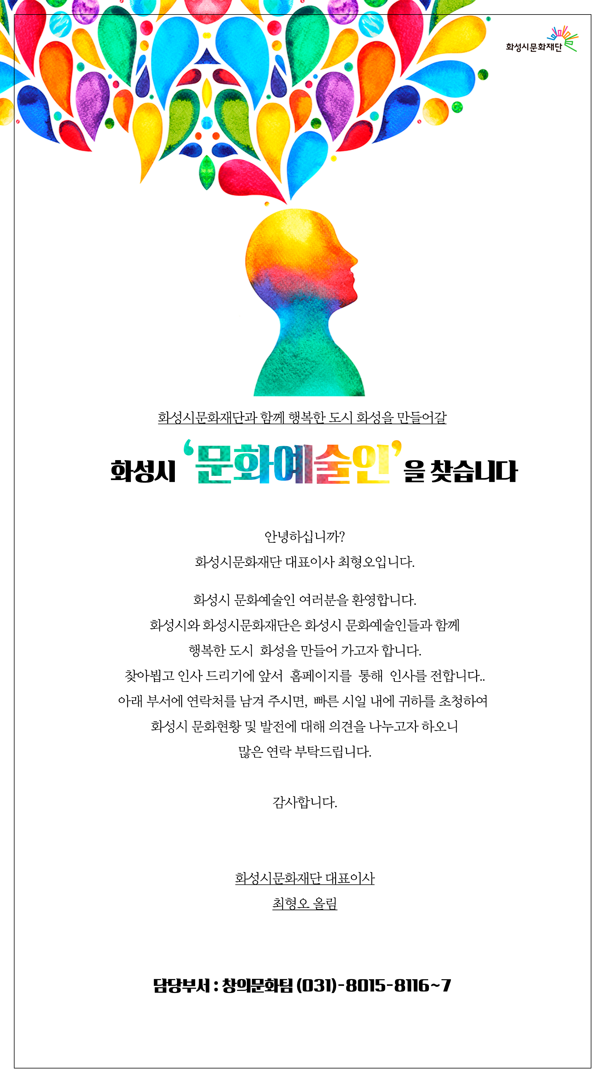 안녕하십니까, 화성시문화재단 대표이사 최형오 입니다.