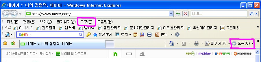 가. 아래와 같이 인터넷창에서 상단의 도구 메뉴 혹은 도구 아이콘 클릭