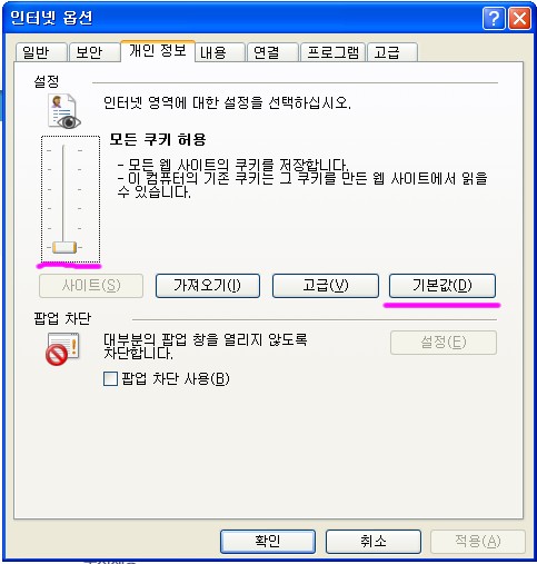 다. 위 화면에서 좌측 슬라이드바를 가장 아래쪽( 모든 쿠키 허용)으로 설정후 확인