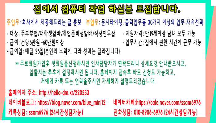 **무료회원가입후 정회원을신청하시면 인사담당자가 연락드리니 상세요강 안내받으시고, 일할지는 추후에 결정하시면 됩니다. 홈페이지 접속후 바로 신청도 가능하고, 저에게 카톡 또는 연락을주시면 자세하게 설명드리겠습니다.