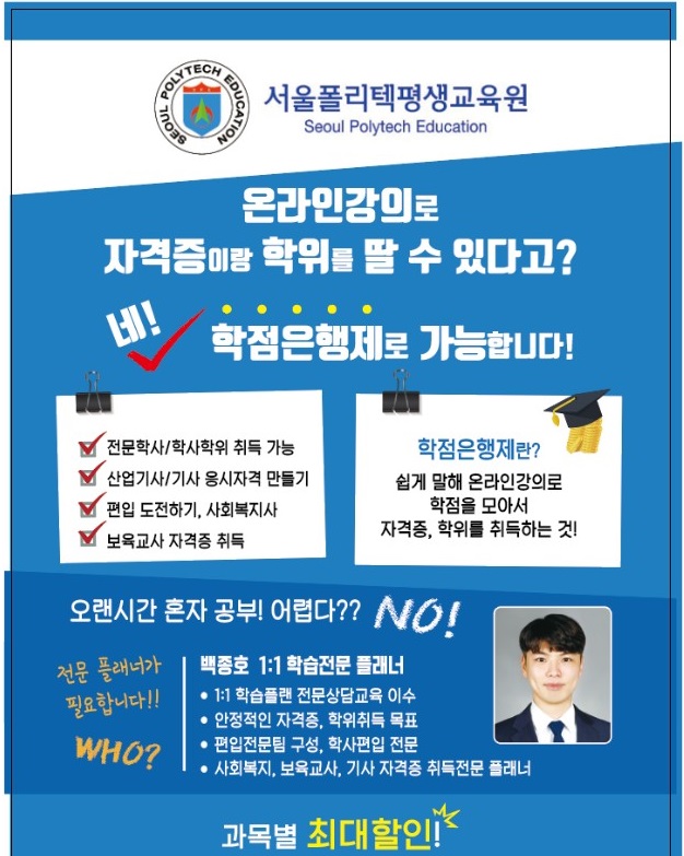 *전졸이상 - 온 라 인 강 의 8과 목 + 대 면 강 의 8과 목 + 실 습1과 목(240시간) = 총 17과목(3학기 과정)
