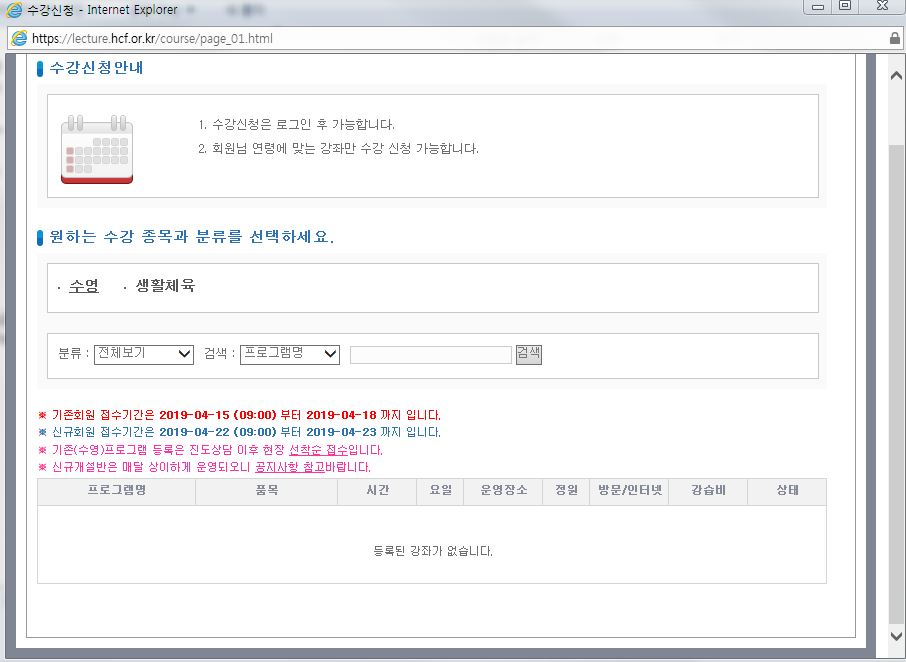 게시판 취지와 관계없는 불법정보 게시, 타인 비방, 광고성 글 등은 예고없이 삭제될 수 있습니다. 스포츠 수영 신규등록 신청 작성자 이성원 작성일 2019년 4월 23일 11시 36분 36초 조회 246 캡처.JPG [ Size : 77.56KB, Down : 100 ] 미리보기 다운로드 인터넷으로 신청하라고 안내받고 신청하려는데, 조회가 되지 않습니다. 이유가 뭘까요? 목록보기