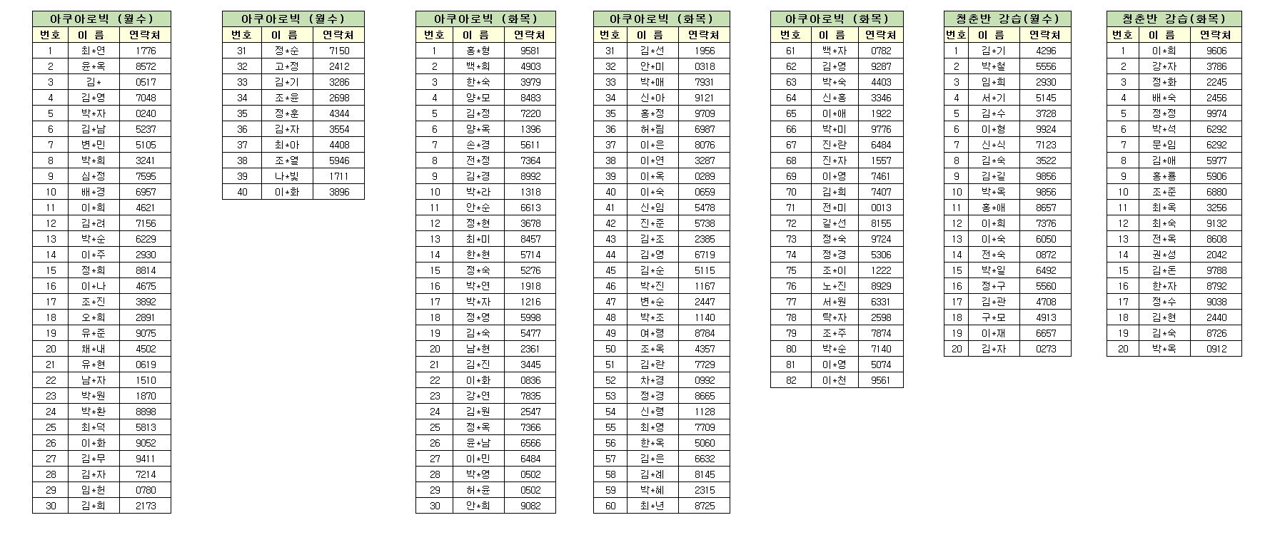 2024년 1월 14일 18시 기준 수영 프로그램 대기자 현황입니다. 대기자 중 2024년 2월 강습 순번도래자 및 등록날짜, 결제방법 등의 자세한 사항은 1월 20일부터 정보마당 → 공지사항을 통해 안내해드리오니 확인 부탁드립니다.