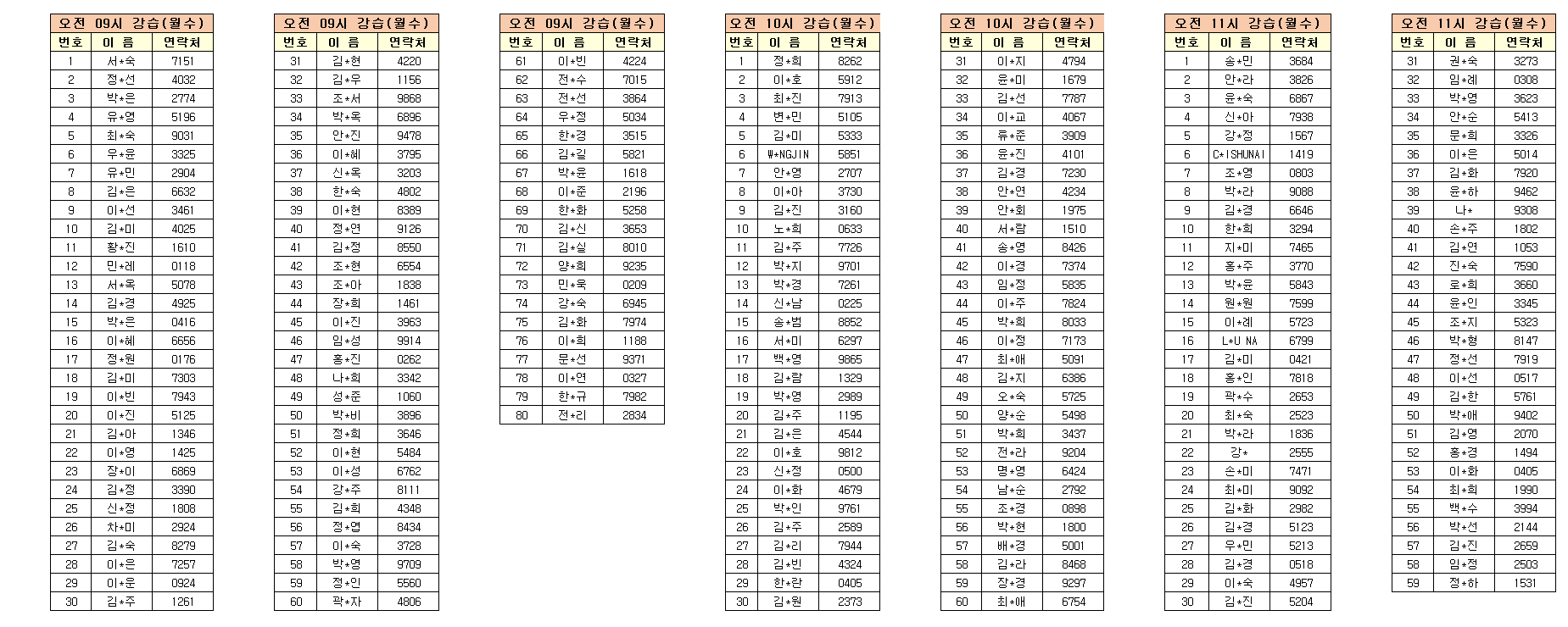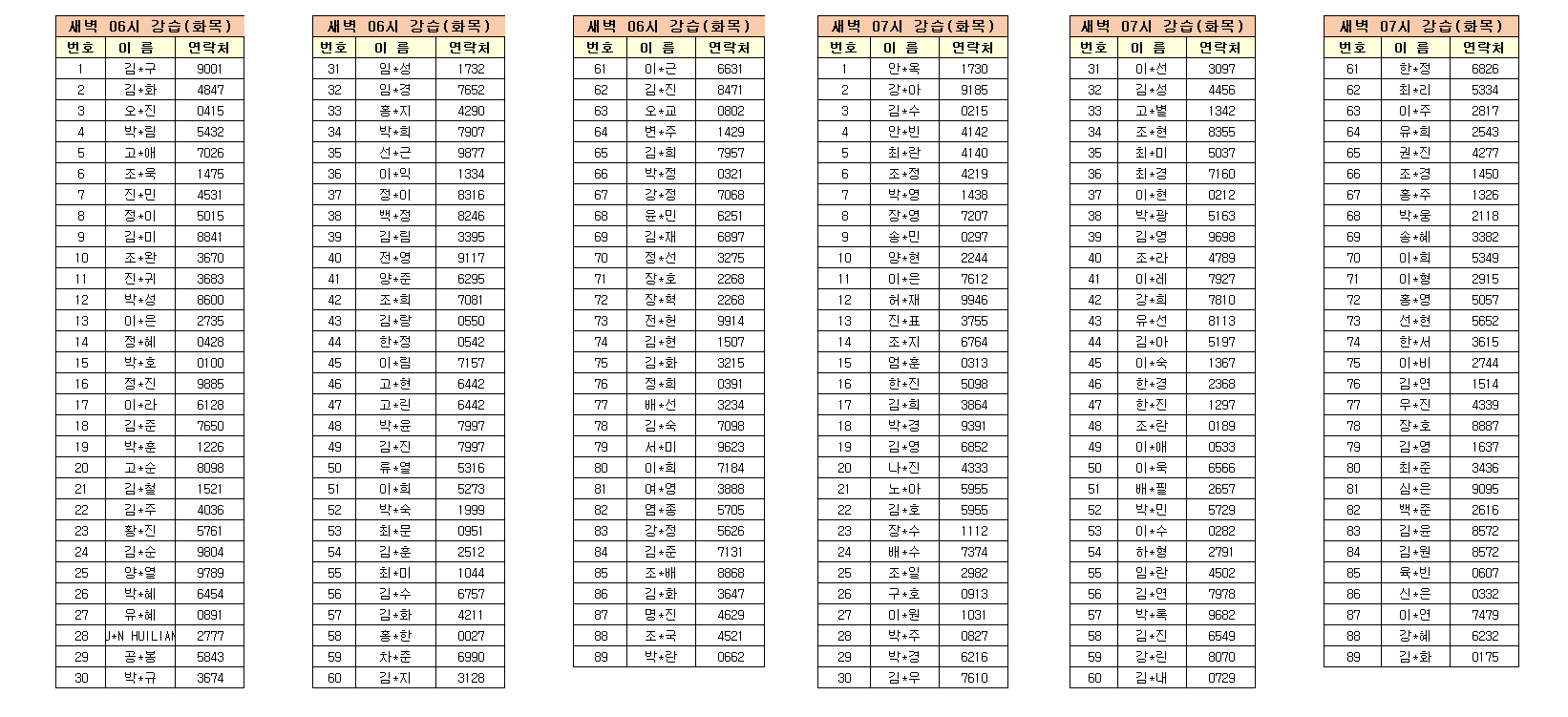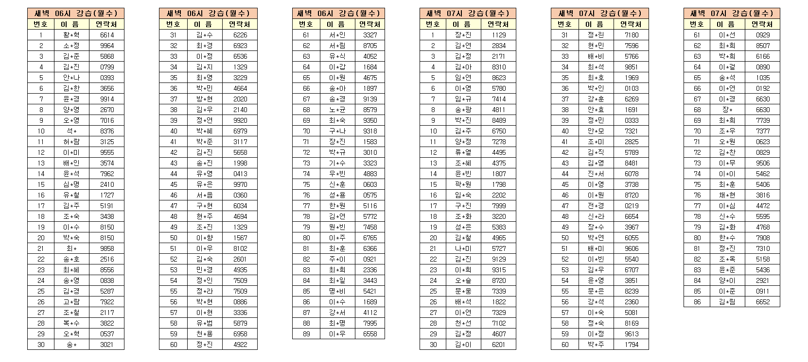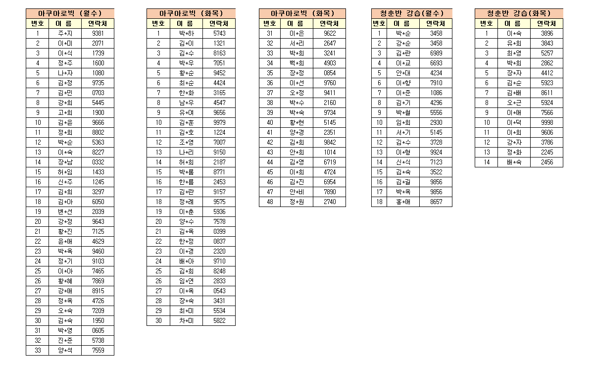 2023년 6월 14일 18시 기준 수영 프로그램 대기자 현황입니다. 대기자 중 2023년 7월 강습 순번도래자 및 등록날짜, 결제방법 등의 자세한 사항은 6월 20일 정보마당 → 공지사항을 통해 안내해드리오니 확인 부탁드립니다.